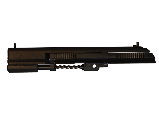 Funktionsweise Masseverschluss mit indirekter Zündung Kaliber 22 lr. ausgelegt für Pistolen Sportmunition (keine High Velocity) Magazinkapazität 8 Schuss Der Verschluss bleibt beim letzten Schuss nicht von selbst offen, kann aber durch Hochdrücken des Verschlusshalters manuell offen blockiert werden. Lauf 125mm, rostträger Stahl Visier Kimmenbreite 3,5mm, seitenverstellbar, pro Teilstrich 8cm auf 25m Korn Breite 3,0 – 3,4 – 3,8mm, höhenverstellbar ¼ Umgang 2cm auf 25m Gewichte Laufträger mit Lauf und Visierung: 400g (9 Para Oberteil 425g), Magazin: 90g (9 Para Magazin 85g) Visierlinienlänge 161mm (9 Para 164mm)