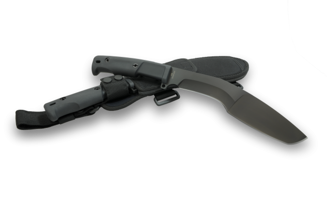 There’s a reason it’s a classic. Made famous by the Gurkha regiments serving under the British crown, the “kukri” is a Nepalese all-purpose blade descended from ancient Greek sickle-shaped swords. It’s ultimately a machete with a top-heavy, forward-positioned cutting edge, which enables it to function as an axe while retaining the versatility of a long blade. Extrema Ratio has developed two such tools, our KS and KH models, blending ancient and modern design concepts. Both employ combination grinds. The razor-like hollow grind closer to the grip yields a fine, sharp edge without compromising the overall thickness of the back of the blade (which needs great sturdiness). The tip portion of the blade is instead flat ground, well-angled to effortlessly penetrate wood and vegetation. While similar tools are usually made from softer steel alloys for elasticity and ease of honing, we were able to achieve adequate elasticity using hard BÖHLER N690 steel, making for a remarkably durable edge.