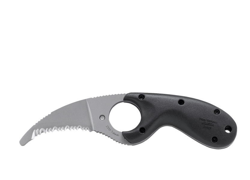 Designt von Russ Kommer. Tropfenförmige Spitze für schnelles Schneiden. Ideal für Notfälle. Mit Reibungsnuten auf dem Klingenrücken, der Klingenspitze und am nicht-geschliffenen Teil der Klinge für maximale Klingenkontrolle und Sicherheit. Wegen dem grossen Loch wirkt das Messer wie eine Verlängerung der Hand. Das Dank dem sicheren Arretierungssystem in der Scheide ist das Messer auch dort gesichert.