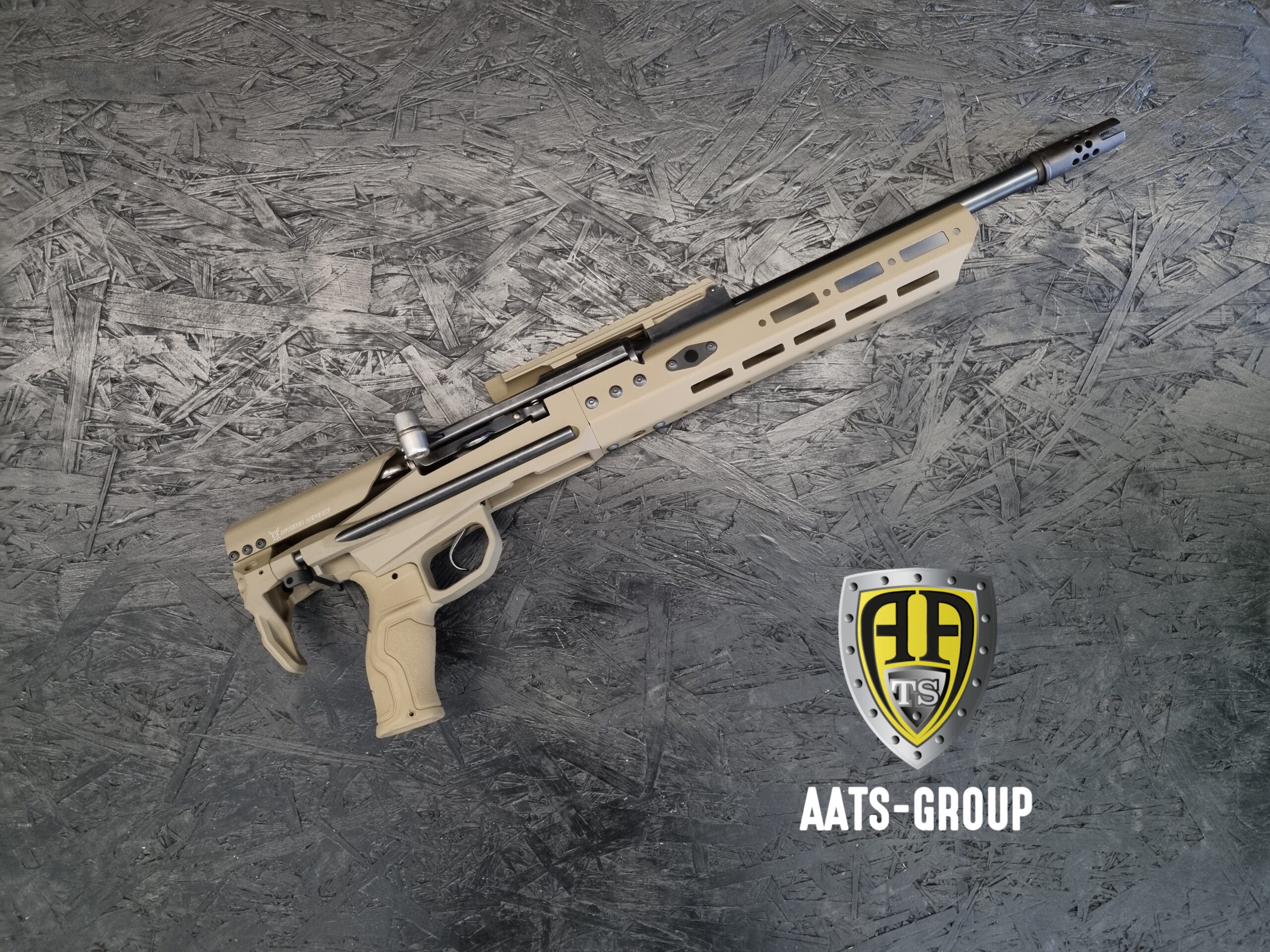 Der K31 wurde ohne Modifikation im Chassis montiert. Der Lauf ist komplett freischwingend. Abzugsgehäuse und Handschutz aus Aluminium CNC bearbeitet und Flat Dark Earth Cerakote beschichtet. Schiebeschaft mit Schaftbacke. QD Riemenbefestigung an Schaftkappe und Handschutz beidseitig.